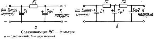 Если коэффициент сглаживания однозвенного RС-фильтра недостаточен, т. е. амплитуда пульсаций в выпрямленном напряжении слишком велика, применяют двухзвенный RС -фильтр. В таком фильтре общий коэффициент сглаживания равен произведению коэффициентов сглаживания отдельных звеньев R1CФ1 и R2CФ2.