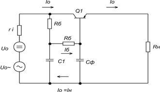 Работа фильтра основана на том, что промежуток коллектор-эмиттер имеет большое сопротивление для переменного тока, или сравнительно небольшое для постоянного, задаваемого рабочей точкой (током базы). Для уменьшения проникновения пульсации в управляющую сеть базы, фильтр R-базы С-фильтра можно усложнить (добавить с ). Кроме этого, вместо VT можно использовать схему РЭ, чтобы уменьшить ток I по сопротивлению .