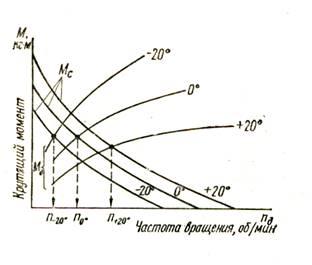 механическую характеристику стартера, то точка их пересечения определит скорость, с которой будет прокручиваться вал двигателя при пуске ( рис.3). чем ниже температура двигателя, тем больше момент сопротивления двигателя прокручиванию и хуже механическая характеристика стартера за счёт снижения температуры А.К.Б., а следовательно, и меньше частота прокручивания вала двигателя.