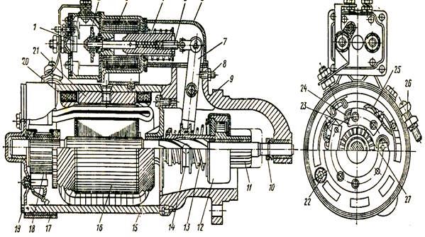 Стартер (рис.4) состоит из корпуса 15, якоря 16, крышек 9 (со стороны привода) и 19 (со стороны коллектора), привода стартера, включающего муфту свободного хода 12, шестерню 11 и поводковую муфту 14. на корпусе стартера укреплено тяговое реле.