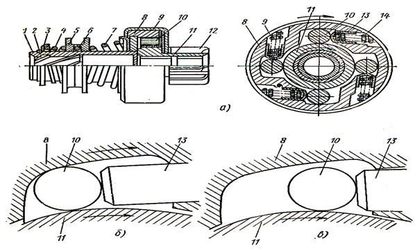 А – конструкция муфты, б – ролик заклинен, муфта передаёт момент, в – ролик вращается, муфта пробуксовывает ; 1 – втулка привода, 2,6 – замочные кольца, 3 – опорное кольцо, 4 – пружина, 5 – поводковая муфта, 7 – буферная пружина, 8 – обойма, 9 – кожух, 10 – ролик, 11 – ступица шестерни, 12 – шестерня, 13 – толкатель, 14 – пружина толкателя.