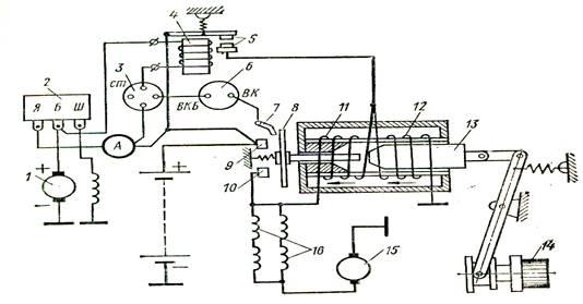 1 – генератор, 2 – реле-регулятор, 3 – выключатель зажигания, 4 – реле включения, 5,7,9,10 – контакты, 6 – катушка зажигания, 8 – диск, 11 – втягивающая обмотка, 12 – удерживающая обмотка, 13 – сердечник, 14 – шестерня, 15 – якорь стартера, 16 – обмотка возбуждения.
