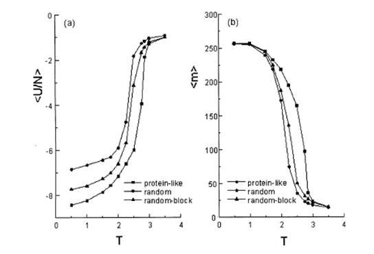Зависимости <U/N> и <m> от температуры для 512-звенной цепи белковоподобного сополимера ( L = 3.173), случайный сополимер