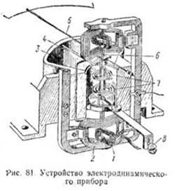 Основными частями электродинамического прибора (рис. 81) являются: неподвижная катушка 2 и подвижная катушка 1, расположенная на оси 6, к которой прикреплена стрелка 5.