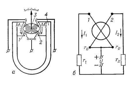 Устройство магнитоэлектрического логометра (а) и схема омметра с магнитоэлектрическим логометром (б): M1