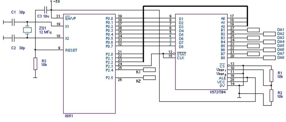 Термостат выполнен на однокристальном микроконтроллере Intel 8051. В качестве многоканального АЦП был выбран 8ми