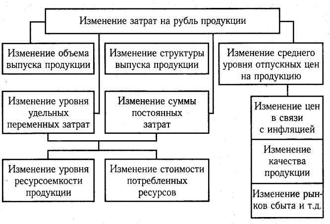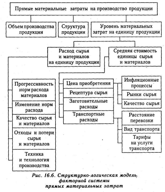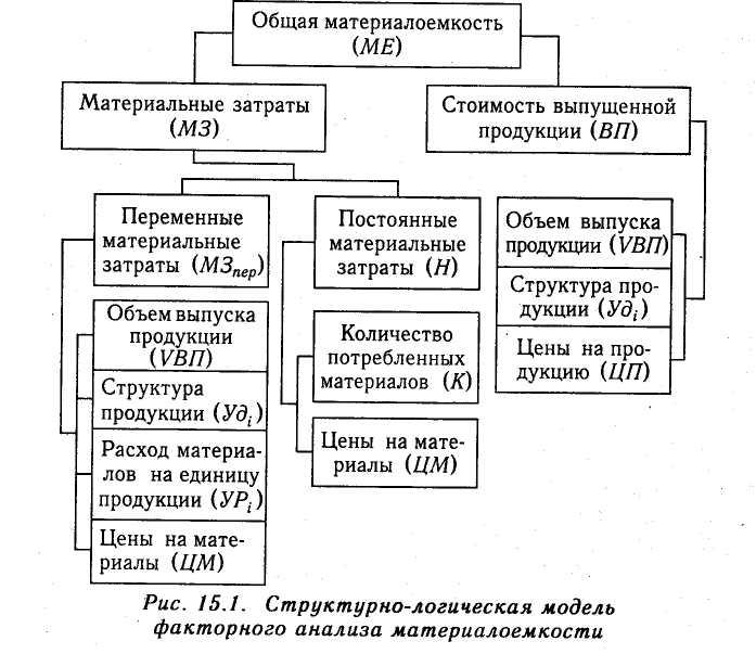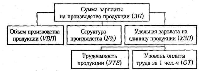 +50 -30 | | Итого | 2620-2590 | +30 | 7. Анализ прямых трудовых затрат Прямые трудовые затраты занимают значительный удельный вес в себестоимости продукции и оказывают большое влияние на формирование ее уровня. Поэтому анализ динамики зарплаты на рубль произведенной продукции, ее доли в себестоимости продукции, изучение факторов, определяющих ее величину, и поиск резервов экономии средств по данной статье затрат имеют большое значение. Общая сумма прямой зарплаты (рис. 16.7) зависит от объема производства продукции, ее структуры и уровня затрат на отдельные изделия. Последний в свою очередь определяется трудоемкостью и уровнем оплаты труда за 1 чел.-ч.  Рис. 16.7. Структурно-логическая модель факторной системы зарплаты на производство продукции Факторная модель общей суммы прямой заработной платы выглядит следующим образом:  Для расчета влияния этих факторов используем метод цепных подстановок:      Общий перерасход по прямой зарплате на весь выпуск товарной продукции составляет 949 тыс. руб. (17 045 - 16 096), в том числе за счет: - увеличения объема выпуска продукции: ΔЗПN = 16 515 - 16 096 = +419 тыс. руб.; - изменения структуры производства продукции: ΔЗПстр = 17 153- 16515= +638 тыс. руб.; - снижения трудоемкости продукции: ΔЗПУТе = 15 589 - 17 153 = -1564 тыс. руб.; - повышения уровня оплаты труда: ΔЗП0Т = 17 045 - 15 589 = +1456 тыс. руб. Зарплата на выпуск отдельных изделий зависит от тех же факторов, кроме структуры производства продукции:  Для расчета влияния данных факторов на изменение суммыпрямой зарплаты по видам продукции используем способ цепной подстановки (табл. 12). Полученные результаты показывают, по каким видам продукции имеется перерасход средств на оплату труда, а по каким — экономия и за счет чего. В основном перерасход зарплата оправдывается увеличением выпуска продукции. По изделиям А и В темпы снижения трудоемкости ниже темпов роста оплаты труда, что является причиной повышения себестоимости этих видов продукции. По изделиям С и D темпы снижения трудоемкости выше темпов роста оплаты труда, что оценивается положительно. Таблица 12 Факторный анализ прямой заработной платы