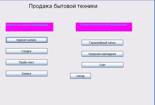 Чтобы перейти форме с бланками документов, нужно нажать кнопку «Бланки» на главной форме, а перейти обратно к главной форме – нажать кнопку «Назад». Аналогично через главную форму можно перейти к форме «Бланки документов».