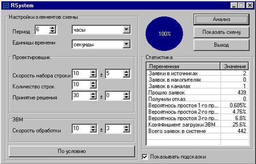 Смоделировать работу системы в течение 6 часов. Определить вероятность простоя проектировщика из-за занятости ЭВМ и коэффициент загрузки ЭВМ.