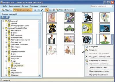 9 . Яким чином розподілені картинки в колекції Microsoft Office ?