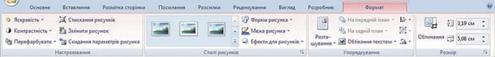 Форматування графічних зображень виконується з використанням елементів керування тимчасової вкладки Формат (рис. 1.42), яка автоматично з’являється на Стрічці в розділі Знаряддя для зображення при виділенні рисунка.