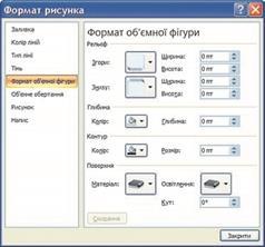 | Ефекти для рисунків | Для відкриття списку ефектів оформлення рисунка ( тінь, об’єм, обертання, рельєф, відбиття та ін.) | |
