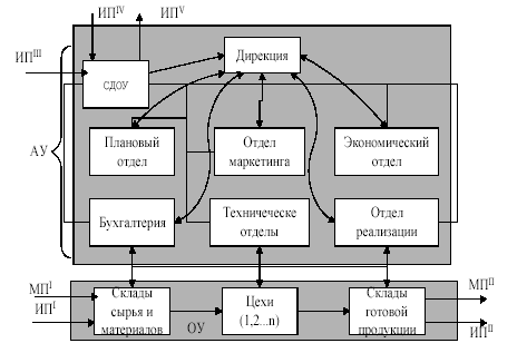 – это подсистема, в которой протекают материальные процессы, т. е. процессы переработки сырья, материалов и прочих ресурсов в готовую продукцию или услуги, т. е. процессы, связанные с переработкой материального потока МП 1 в материальный поток МП 2. Кроме того, на вход ОУ поступают также внешний информационный поток ИП 1, который сопровождают материальный, например, "Накладные на транспортировку", "Счета - фактуры на оплату " и др. То же можно сказать и о потоке ИП 2, которые сопровождают отпуск готовой продукции или услуг потребителям.