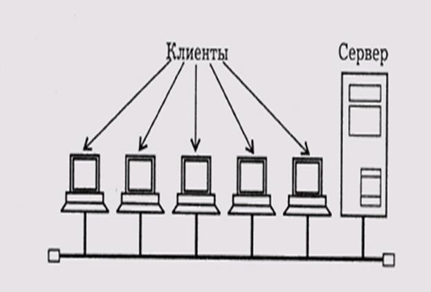 Сеть на основе сервера отличается от одноранговой тем, что специализированный компьютер (иногда несколько компьютеров) осуществляет управление всеми рабочими местами (или определенной группой), выполняя наиболее важные задачи, позволяющие сети функционировать как единое целое. Если в одноранговой сети функции сервера может выполнять любая клиентская машина, то здесь это невозможно. Различие в производительности между сервером и рабочим компьютером, как правило, очень велико. Рабочий компьютер может иметь ограниченную и, поэтому недорогую, комплектацию, сервер же, наоборот, оснащается специализированными высокопроизводительными комплектующими, которые практически не используются в обычных офисных или домашних компьютерах. Являясь «ядром сети», сервер оптимизируется под непрерывную обработку клиентских запросов. Управление сервером осуществляется специальными операционными системами, обеспечивающими надежную защиту информации, централизованный контроль и управление сетевыми ресурсами.