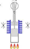 - Внешний источник тепла нагревает газ в нижней части теплообменного цилиндра. Создаваемое давление толкает рабочий поршень вверх (обратите внимание, что вытеснительный поршень неплотно прилегает к стенкам).