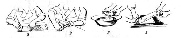 М'який бинт розстелюють на гладкому столі і на нього насипають гіпсовий порошок, попередньо просіяний (щоб уникнути потрапляння грудочок, камінчиків), рівним шаром. Край бинта притримують одною рукою, а іншою, рухами зліва направо, насипають гіпс (мал. 3), немов втираючи його в бинт долонею. Нагіпсований бинт нещільно згортають. Для лонгет приготування бинтів аналогічне, нагіпсовані бинти шарами складають один на одного (4 шари). Розмір лонгет визначають довжиною сегмента кінцівки, на котрий буде накладатися гіпсова пов'язка. Згортають лонгет із двох сторін. Лонгети застосовують для виготовлення гіпсових шин і зміцнення циркулярних гіпсових пов'язок. Мал. 3. Етапи приготування гіпсових бинтів.