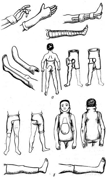 При ураженні шийних і верхніх грудних хребців застосовують гіпсові корсети з нашийником, а при ураженні грудних хребців у середньому відділі хребетного стовпа (мал. 8) і при ушкодженні або захворюванні поперекових і крижових хребців використовують корсети без плічок із захопленням тазового пояса або одного зі стегон.