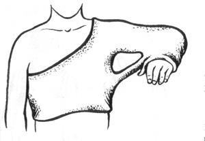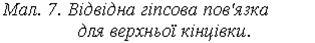 На верхню кінцівку циркулярну гіпсову пов'язку кладуть за тими ж правилами (комбінація гіпсових шин і циркулярних гіпсових бинтів) тільки в стаціонарних умовах. Для фіксації плечового суглоба і при переломах плечової кістки накладають відвідну (абдукційну) гіпсову пов'язку, що складається з корсета, гіпсової пов'язки на кінцівку і дерев'яну розпірку між ними (мал. 7). Накладання циркулярної пов'язки на верхню кінцівку нерідко викликає порушення кровообігу та ішемічну контрактуру, тому краще фіксувати кінцівку глибокою шиною. У підкрильцеву ямку кладуть ватно-марлеву клиноподібну подушку, щоб уникнути виникнення привідної контрактури плечового суглоба.