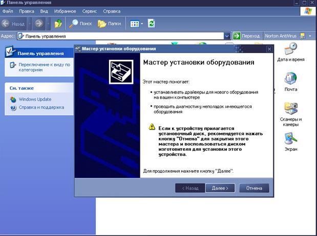 При работе с РС широко используются разные дополнительные устройства: принтеры, сканеры, модемы, цифровые камеры и прочее оборудование совместимое с компьютером. Поэтому необходимо уметь подключать, устанавливать, настраивать оборудование. Большинство современное компьютерной техники имеет индекс «PlugandPlay», что дословно значит «подключи и играй». Это значит, что это устройство автоматически определяется системой, и потом просто просит вставить диск с драйвером оборудования. В операционных системах Windows имеется специальная программа для подключения оборудования – «мастер подключения оборудования». Он значительно упрощает работу с техникой. Он находится на панели управления. Также с помощью мастера можно устранять неполадки.