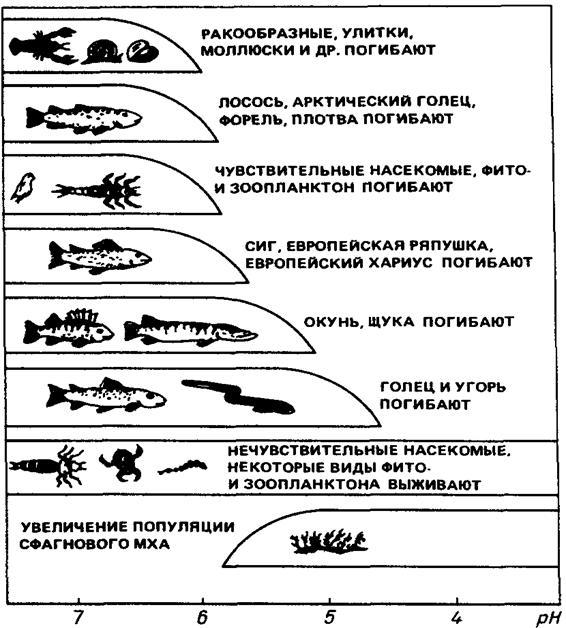 земноводных, фито- и зоопланктона, а также множества прочих живых организмов. Можно заметить характерные различия (во флоре и фауне) озер, вода которых имеет близкий состав питательных веществ и ионов, но различную кислотность. До определенных пределов млекопитающие, в том числе и человек, защищены от вредного влияния кислотности, однако в организмах водных животных накапливаются ядовитые тяжелые металлы, которые могут попасть в пищевую цепочку. Наибольших масштабов достигло закисление озер и рек в Швеции, Норвегии, США, Канаде, но этот процесс уже начал распространяться в Дании, Бельгии, Голландии, ФРГ, ГДР, Шотландии и Югославии.