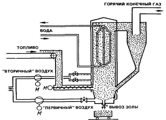 В зону горения (с перфорированной подстилкой) направляют поток несгораемого вещества, связывающего серу. Всасываемый снизу с большой скоростью воздух измельчает и перемешивает вещество, находящееся в объеме горения. С помощью этого процесса можно не только уменьшить выброс двуокиси серы, но и снизить количество образующегося оксида азота NO, так как при этом снижается температура горения.