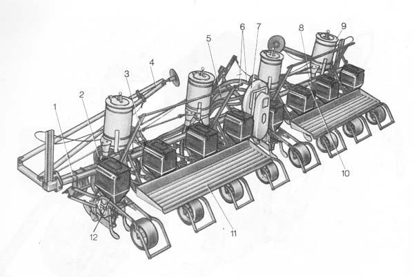 1 - рама, 2 - колесо, 3- кронштейн, 4 - маркер, 5 - замок, 6 - воздуховоды, 7-вентилятор, 8- тукопровод, 9 - аппарат туковысевающий, 10 - чистик, 11 - подножка, 12 - секция