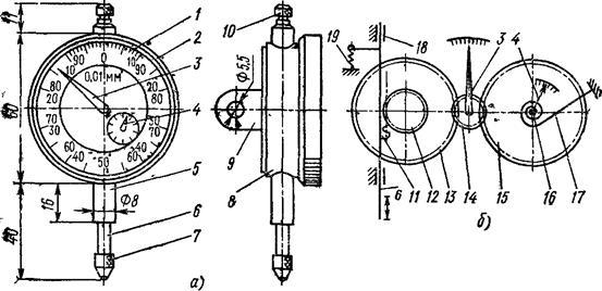 (рис. 3, а). Гильза и ушко служат для крепления индикатора на стойках, штативах и приспособлениях. Поворотом ободка 2,