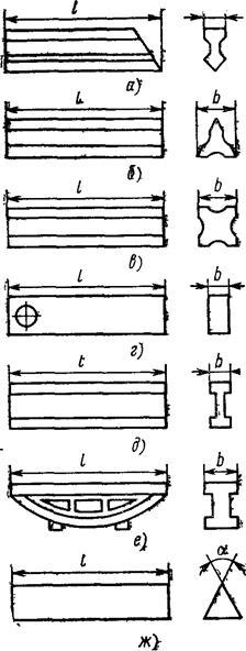 изготовляются следующих типов: ЛД — лекальные с двухсторонним скосом (рис. 7, а); ЛТ—лекальные трехгранные (рис. 7,6); ЛЧ—лекальные четырехгранные (рис. 7, в); ШП — с широкой рабочей поверхностью прямоугольного сечения (рис. 7, г); ШД—с широкой рабочей поверхностью двухтаврового сечения (рис. 7,и); ШМ—с широкой рабочей поверхностью, мостики (рис. 7, е);