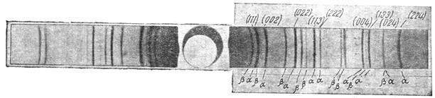 1. Чем больше длина волны применяемых лучей, тем дальше от центра располагаются линии, соответствующие отражениям. от одних и тех же плоскостей одного и того же кристалла. Правильность такого утверждения вытекает из того факта, что большим длинам волн будут соответствовать большие углы скольжения,. а при увеличении последних, согласно уравнению (#), увеличивается расстояние между линиями на рентгенограмме. Таким образом, длина волны применяемых лучей является весьма важным фактором, определяющим построение самой рентгенограммы. Снимая рентгенограммы с одного и того же вещества на разных. излучениях, мы никогда не получим тождественной картины. Полученные рентгенограммы будут отличаться одна от другой и по положению линий и по числу их. На рентгенограммах, полученных на излучении с большими длинами волн, число этих линий будет меньше, и, наоборот, при съемке рентгенограмм на коротковолновом излучении число линий возрастает.