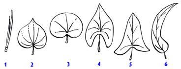 Рис.2. Особые формы листовых пластинок. 1 - игольчатая, 2 - серцевидная, 3 - почковидная, 4 - стреловидная, 5 - копьевидная, 6 - серповидная.