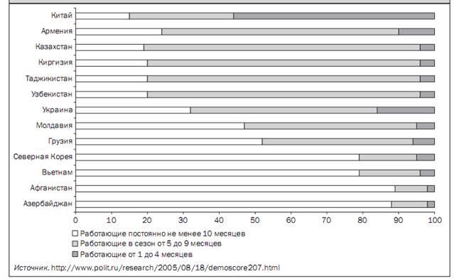 Рисунок 2.1 Распределение трудовых мигрантов из разных стран по продолжительности работы в России (2008г)