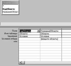 Создадим запрос, позволяющий удалить запись в таблице "Области". Откройте вкладку "запросы", нажмите кнопку "Конструктор". Добавьте в запрос таблицу "Области". Выберите тип запроса "Удаление". Настройте запрос в соответствии с рисунком.