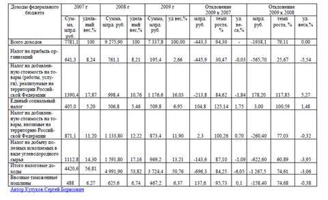 Доходы федерального бюджета Российской Федерации в период 2007 – 2009 годов формировались за счет налоговых и неналоговых поступлений. Налоговые поступления включали: налог на прибыль организации, единый социальный налог (отменен с 1 января 2010 года), налог на добавленную стоимость на товары (работы, услуги), реализуемые на территории Российской Федерации, налог на добавленную стоимость на товары, ввозимые на территорию Российской Федерации, налог на добычу полезных ископаемых в виде углеводородного сырья. Неналоговые поступления включают: ввозные таможенные пошлины, вывозные таможенные пошлины на сырую нефть, вывозные таможенные пошлины на природный газ, вывозные таможенные пошлины на товары, выработанные из нефти, прочие поступления