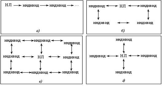 3) принцип мягкой регламентации. Процесс самоуправления не может быть жестко регламентированным законодательными актами и положениями организации. Иначе самоуправление вырождается в обычное управление. Итак, самоуправление трактуется как демократизация управления, обеспечивающая работникам возможность участвовать в процессе принятия решений, влиять на положение дел в организации, на производственном предприятии. Понятие "самоуправление" выражает довольно устойчивый тип социального образования или общественных отношений. Полностью самоуправляемой считается система, не имеющая над собой ни одного вышестоящего органа управления (например, частная фирма). Организация самоуправляема частично в том случае, если она представляет собой объект (элемент, звено, подсистему) в более сложной иерархической структуре (ряд предприятий и фирм входят в состав ОАО). Вообще, самоуправление на любом уровне управления представляется как процесс превращения человека, всего трудового коллектива из объекта управленческой деятельности в ее субъект. На производстве формируется особый вариант организации управления, когда коллектив сам решает вопросы комплектования бригады либо иного коллективного формирования, распределения трудовых функций и совместного заработка. Речь идет о простейшем виде коллективности, ассоциации трудящихся, регулирующей реальное соединение работников со средствами производства и распределение по труду, т.е. осуществляющей ключевые организационно-экономические процессы. Организация самоуправления на производственном предприятии соединяет в себе труд и управление, иными словами, на производстве складывается новый тип социально-экономических отношений между равноправными субъектами в процессе их совместной трудовой деятельности по поводу управления на предприятии. Самоуправление имеют схемы отношений, аналогичные организационным отношениям в формальном управлении. Это типовые схемы отношений в виде линии, кольца, колеса, звезды и т.д., в которых основным элементом является не руководитель, а неформальный лидер (НЛ). (Рис. 11)