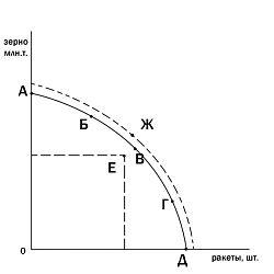 В данном случае точки А, Б, В, Г, Д - точки, принадлежащие КПВ. Точка E внутри графика КПВ означает неполное или нерациональное использование имеющихся ресурсов . Точка Ж (вне кривой) недостижима при данном количестве ресурсов и имеющейся технологии. Попасть в эту точку можно, если увеличить количество используемых ресурсов или улучшить технологию производства (например, сменить ручной труд на машинный). При движении по кривой возможен только один, лучший вариант движения, который дает максимальный результат при минимальных затратах. Кривая производственных возможностей показывает совокупность всех точек или решений, в пределах которых следует выбирать оптимальный вариант. Все остальные точки представляют собой упущенные возможности или альтернативные затраты .