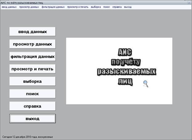 Внешний вид главного окна разработанного в курсовом проекте приложения представлен на рис.2. В главном окне приложения располагается восемь кнопок при нажатии, на которые мы перейдём в интересующий нас раздел. Приложение также содержит главное меню. Разработанное приложение выполняет такие функции как: ввод данных (информацию о разыскиваемых лицах), просмотр интересующих данных, фильтрацию по каким либо показателям, просмотр и печать необходимой нам информации, поиск интересующей нас информации и получение справки по конкретным вопросам. Позволяет загружать фотографии разыскиваемых лиц из различных графических форматов. Загружать информацию о разыскиваемом лице из текстовых файлов (txt, doc) и т. д.