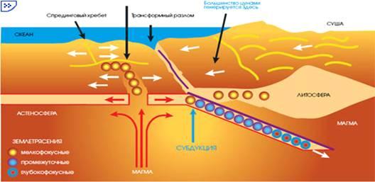 Цунами возникают в следующих условиях. Тектонические процессы, протекающие в глубинах земли, вызывают появление разрывов в толще горных пород. Такие разрывы происходят, как правило, внезапно и сопровождаются землетрясениями. При разрывах, которые дают сбросы, надвиги и сдвиги, образуются смещения горных пород на поверхности земли, и соседние участки перемещаются по ним, причем иногда на десятки метров. Если подобные смещения происходят на дне океана, то, как в толще воды, так и на ее поверхности возбуждается волна, с большой скоростью распространяющаяся во все стороны от места возникновения.