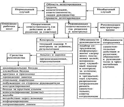 2. Инструкция (указания) по руководству. Она содержит обязательные и для руководителя, и для подчиненных принципы их взаимоотношений. В этой инструкции в письменной форме фиксируются правила и принципы, определяющие права и обязанности работников. Согласно Р. Баумгартену, инструкция по руководству содержит в себе прежде всего критерии, по которым оценивается успех руководства, а также принципы делегирования: определение задач, компетенций и ответственности, разграничение и конкретизация руководящей и оперативной ответственности, указание исключительных случаев вмешательства в область делегированных заданий и полномочий.