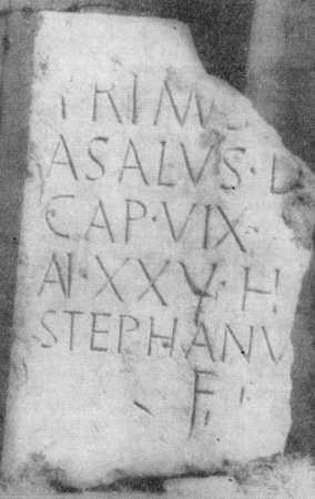 Другая надгробная надпись, найденная в 1963 г. у дорожной станции Варианы в соседстве с Августой, на римском пути вдоль Дуная, принадлежит солдату из той же капитониановой алы. Этот памятник, правая половина которого утеряна, представляет собой толстую гладкую, почти квадратную плиту, высотою в 90 см и толщиной около 40 см, без рамки и украшений. На ней начертаны буквы высотой 8 см. Такие плиты, единственным украшением которых является сама надпись с правильно и красиво вырезанными словами, разделенными треугольными знаками, ставились в северной Италии и Паннонии до середины I в.10