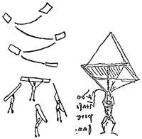 Первую же конструкцию подобного аппарата разработал не кто иной, как великий Леонардо да Винчи. "Если человек возьмет полотняный натянутый купол, - писал он, - каждая сторона которого имеет двенадцать локтей ширины и двенадцать локтей высоты, то он сможет безопасно сброситься с любой высоты". Учитывая, что площадь указанного натянутого купола примерно равна площади современного парашюта, остается только восхититься точности предсказаний гениального итальянца. К чести Леонардо заметим, что сам он не решился испытывать свое изобретение на себе, благодаря чему, видимо, и прожил долгую и счастливую жизнь. Замечательная же идея его в течение долгого времени так и оставалась на бумаге.