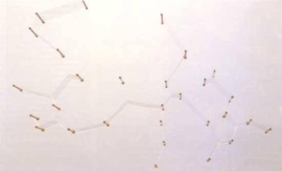 | Компьютер из мыльной плёнки (вверху) соревнуется с электронным компьютером (внизу), отыскивая кратчайшую сеть, связывающую между собой 29 городов. Компьютер из мыльной плёнки, в котором расположение штырьков моделирует географию городов, минимизирует длину плёночных соединений в локальной области. Он даёт короткую сеть, но необязательно кратчайшую. Электронный компьютер реализует алгоритм Э. Кокейна и Д. Хьюджилла из Университета Виктории. Алгоритм гарантирует кратчайшую сеть. Задача с 29 точками на сегодня близка к пределу вычислительных возможностей.