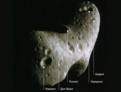 Если Гаспра — «курортный» астероид, то Матильда — «шахтерский». Это один из самых темных объектов в Солнечной системе, отражающий лишь 3% падающего света. Поэтому кратерам на Матильде дали названия угольных бассейнов земного шара. Здесь можно встретить польский Люблин, сибирский Кузнецк, болгарскую Марицу, французскую Лотарингию, немецкий Ахен. Астероид Эрос — конечно же «любовный», его кратеры названы именами персонажей мифов и легенд, связанных с любовью и эротикой. Парочками расположены здесь кратеры Орфей и Эвридика, Дон Кихот и Дульсинея, Аида и Радамес, Пигмалион и Галатея. Несколько кратеров получили имена реальных личностей. Так, названия Джахан и Махал напоминают об индийском султане XVII века Шах-Джахане и его жене Мумтаз-Махал, для которой султан возвел знаменитый мавзолей Тадж-Махал. Не остались без внимания как вымышленный Дон Жуан, так и вполне реальный итальянский авантюрист Казанова.