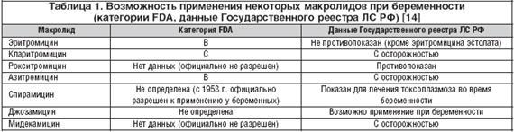 Из АМП основные β–лактамные антибиотики (пенициллины и цефалоспорины) и макролиды ; – эритромицин и азитромицин, отнесены по классификации FDA к категории «В»; кларитромицин, гентамицин, фторхинолоны, ко–тримоксазол, рифампицин, ванкомицин, линезолид и некоторые другие – к категории «С»; большинство аминогликозидов, тетрациклины и сульфаниламиды (перед родами) – к категории «D». Для многих макролидов (джозамицина, мидекамицина, спирамицина, рокситромицина) категории FDA не определены [13]. Официальная информация о возможности применения макролидов при беременности согласно категориям FDA и типовым клинико–фармакологическим статьям Государственного реестра ЛС РФ приведена в таблице 1 [14].
