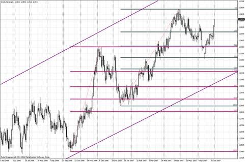 Рассмотрим пример. В паре евро/доллар действует долгосрочная восходящая тенденция. На рисунке 1 основной восходящий тренд обозначен сиреневыми линиями. Мы наблюдали сильное восходящее движение от $1.2480 до $1.3360, после чего это движение затормозилось, и пара вступила в фазу коррекции. Растянув Fibo от $1.2480 до $1.3360, мы увидели, что длина коррекции составила 50.0. Это считается довольно глубокой коррекцией. Фаза коррекции сменилась сильным восходящим движением ($1.2860-$1.3680). Далее снова последовала нисходящая коррекция. Стоит отметить, что после того, как Вы убедились, что пара вышла из стадии коррекции, уровни Фибоначчи целесообразно удалить. Не стоит загромождать график «старыми» Фибоначчи.