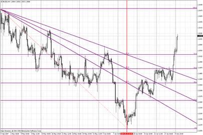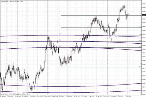 При построении дуг Фибоначчи (Fibonacci Arcs) две экстремальные точки соединяются прямой. На восходящем тренде эта прямая растягивается от минимума к максимуму, на нисходящем - наоборот. Далее наносятся три дуги с центром во второй экстремальной точке, пересекающие линию тренда на уровнях Фибоначчи 38, 2%, 50% и 61, 8%.