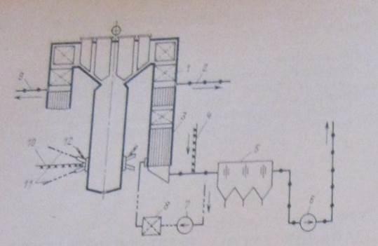 1 - регулирующая ступень промежуточного пароперегревателя; 2 — отбор инертных газов для разомкнутой пылесиоемы Б; 3 - трубчатый воздухоподогреватель; 4 — сброс отработавшего сушильного агента из пылесистемы Б; 5 — электрофильтры; 6 — дымосос Д-25Х2ШУ; 7 — дутьевой вентилятор ВД-32Н; 8 — калориферы; 9 — отбор инертных газов для замкнутой пылесистемы А; 10 — сброс отработавшего сушильного агента из пылесистемы А; 11 — подвод горячего воздуха к плоскофакельной горелке; 12 — пылепровод высококонцентрированной подачи угольной пыли