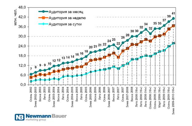 По данным ФОМ (Фонд Общественного Мнения) в России зимой 2010 года число пользователей Интернета перешагнула отметку в 40 млн. человек и составляет более 41 млн. Необходимо отметить, что даже финансово-экономический кризис не оказал никакого влияния на динамику увеличения количества пользователей Интернета. Так, в 2009 году по сравнению с 2008 годом рост Интернет аудитории составил 22 %.