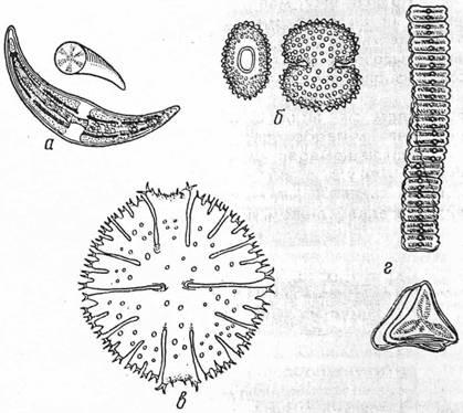 Рис. 2. Десмидиевые водоросли: а — клостерий; б — космарий; в — микрастерий; г — десмий.