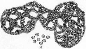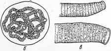 Подойдите к пруду, и у берега вы увидите плавающую черноватую корку. Это колонии микроцистиса (рис. 5, а), составленные клетками с газовыми пузырьками; за счет пузырьков и появляется черноватый оттенок. Но иногда в воде попадаются слизистые комочки зеленовато-голубого цвета, размером с куриное яйцо. Под микроскопом же в слизи видны цепочки клеток. Это носток (рис. 5, б). Размножается растение следующим образом: звенья цепочек удлиняются, а затем отламываются в определенных местах. Отколовшаяся часть покидает основную колонию, через некоторое время выделяет слизь и разрастается в новую.