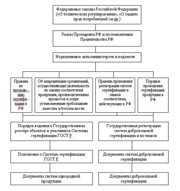 актами министерств и ведомств). Сертификация продукции в РФ проводится на основании законов РФ «О техническом регулировании», «О за щите прав потребителей», а также законов, относящихся